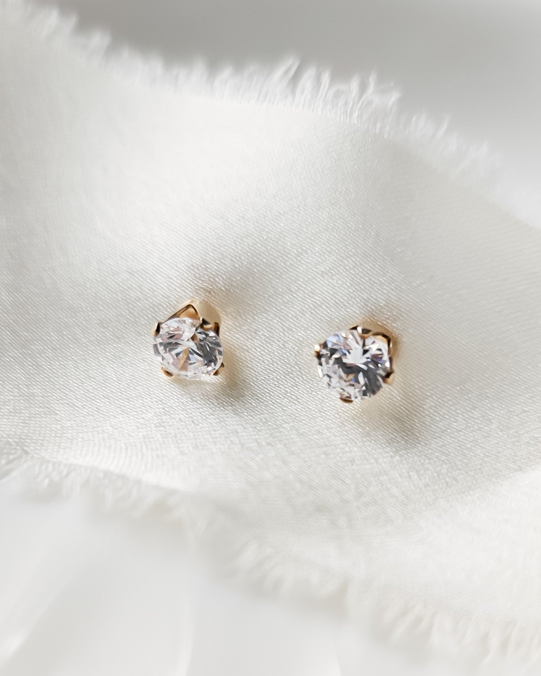 A pair of elegant 14k gold filled stud earrings featuring claw-set, faceted cubic zirconia crystals. These minimalist gold earrings have a timeless yet modern design, effortlessly balancing simplicity and sparkle.