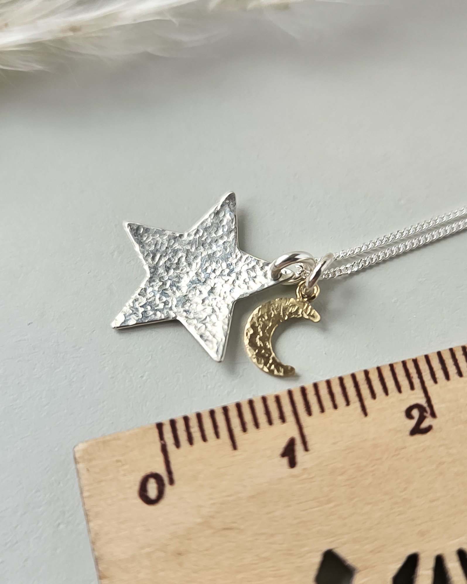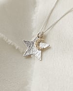 A beautiful mixed metal star and moon necklace, featuring a hand-hammered sterling silver star pendant with a delicate 14k gold filled moon charm.