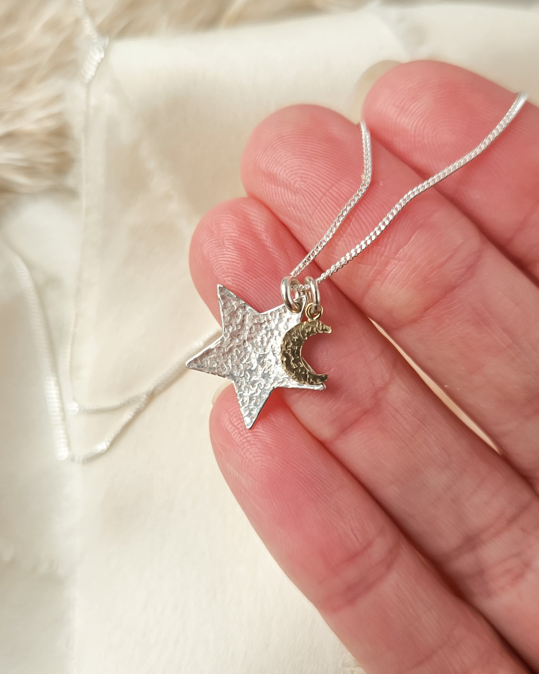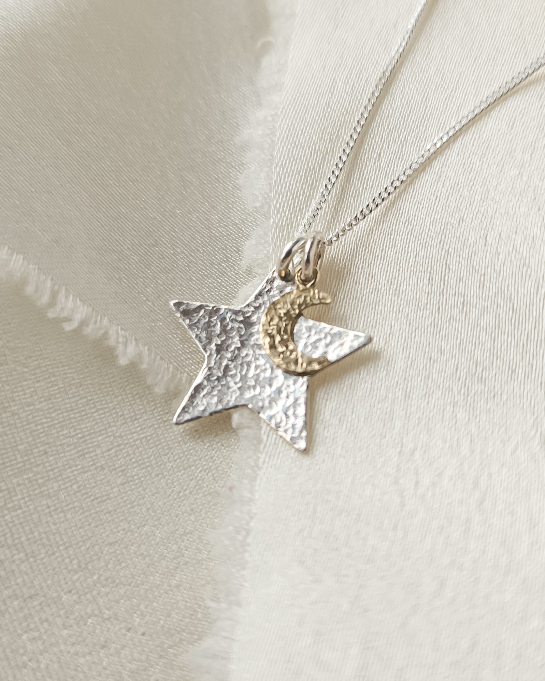 The sterling silver star is hand-hammered with layered textures, creating a unique light catching shimmer. Gently domed for an organic, artisan feel. The tiny gold moon charm features my signature textured finish, adding a subtle celestial touch.