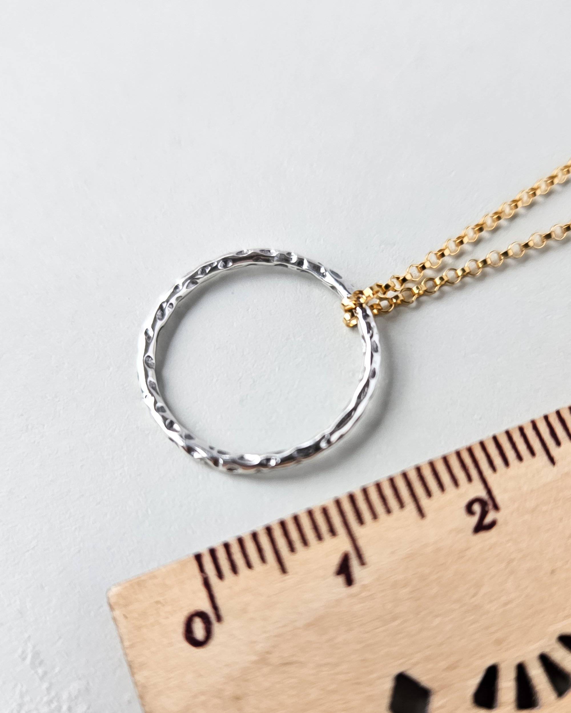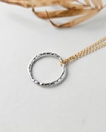 The open circle pendant has a tactile, mottled texture that creates a subtle rustic finish while still feeling refined and contemporary. Lightweight and comfortable, this gold and silver pendant necklace is perfect for everyday wear.