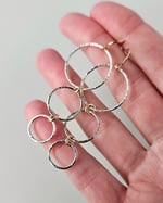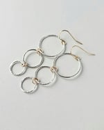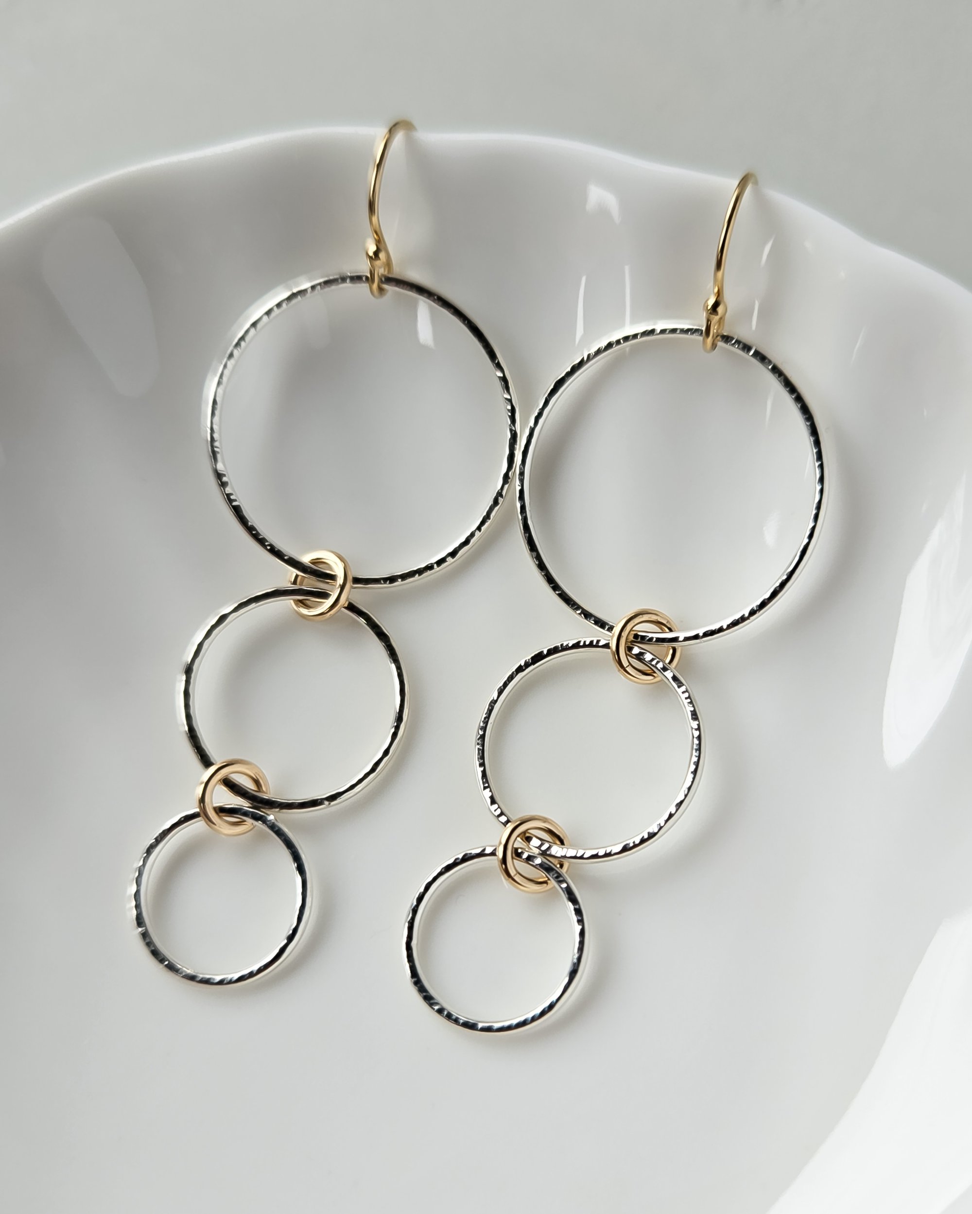 Add a touch of modern elegance with these two tone hammered sterling silver drop earrings featuring 14k gold filled accents. Designed with three graduating open circles, this contemporary handmade design beautifully combines silver and gold for effortless everyday wear.